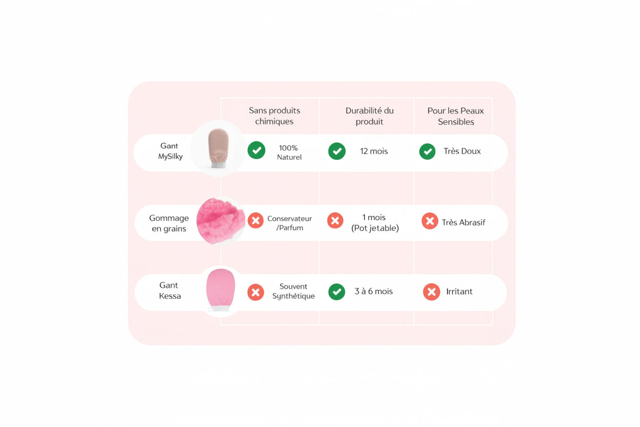 La soie de mûrier fonctionne par friction. Le savon rend la peau trop glissante, ce qui empêche le gant d'accrocher et de retirer les peaux mortes. Utilisez le savon uniquement après pour rincer votre corps.